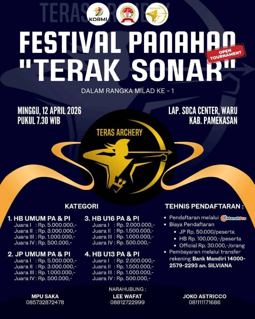 FESTIVAL PANAHAN TERAK SONAR Open Tournament Tanggal Pelaksanaan : 12 April 2026 Terakhir Pendaftaran : 05 April 2026 Lokasi : Lap. Soca Center, Waru https://maps.app.goo.gl/4e6HUGG4Ccb43rD26 Technical Handbook : https://drive.google.com/drive/folders/1iJ4wKHJG0EtEvSt9lJitRmjkQCqozLQC Contact Person : Lee Wafat