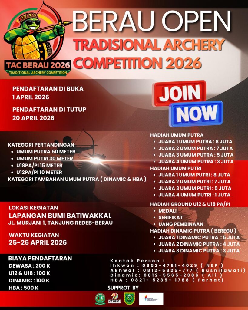 Kabar gembira untuk pecinta panahan tradisional! Tahun 2026, Berau Open Tradisional Archery Competition (TAC Berau 2026) siap digelar dengan skala yang lebih besar dan hadiah yang sangat menarik.